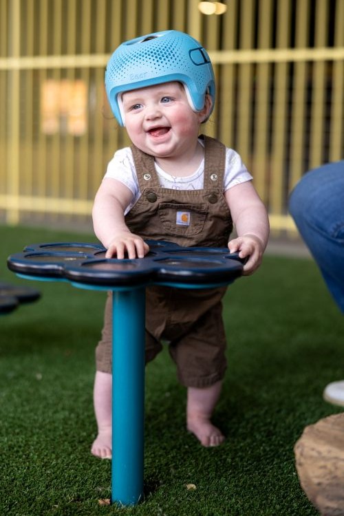 Katie Thunder, mother of 8-month-old Addison Joan (AJ), noticed limited cervical rotation in her daughter at just 2 weeks of age. AJ was subsequently diagnosed with congenital muscular torticollis, a condition characterized by unilateral shortening of the sternocleidomastoid muscle. Following physical therapy, AJ’s range of motion improved, but persistent occipital flattening prompted a referral to Gillette Children’s at 4 months of age.